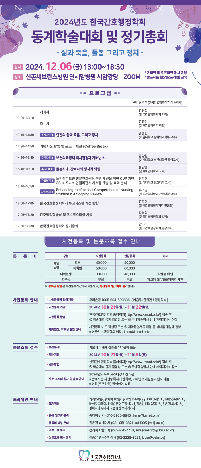 | [한국간호행정학회] 2024 동계학술대회 개최 안내- 24.12.06.(금), 신촌세브란스병원/ZOOM 동시 운영 |