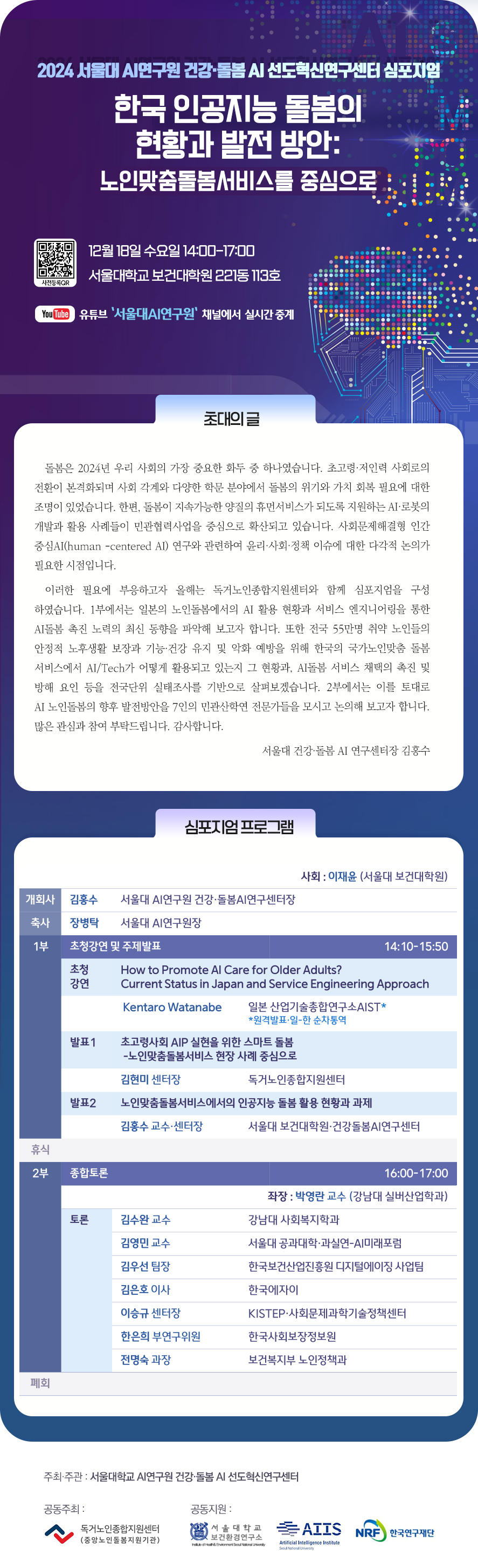 | 건강·돌봄 AI 선도혁신연구센터] 2024 건강 돌봄 AI 연구센터 심포지엄 개최 12. 18.(수) 14:00~17:00 유튜브송출 |