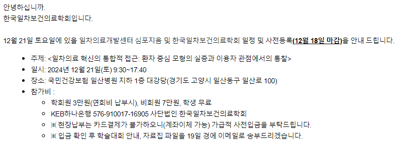 | [한국일차보건의료학회] 일차의료개발센터 심포지움 및 한국일차보건의료학회 학술대회 <일차의료 혁신의 통합적 접근: 환자 중심 모형의 실증과 이용자 관점에서의 통찰> |