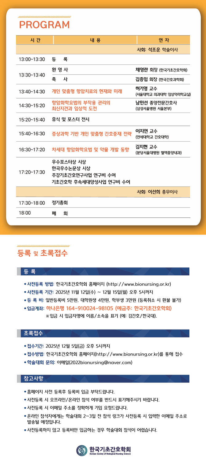 한국기초간호학회에서 "항암화학요법의 최신 동향 및 개인 맞춤형 간호 전략"을 주제로 동계학술대회를 개최하오니, 관심 있는 회원 여러분의 많은 참여 바랍니다.