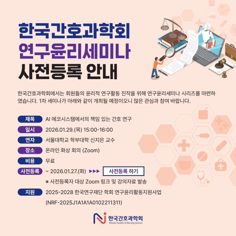 | [한국간호과학회] 연구윤리세미나 - 26.01.29.(목), 줌 온라인 |