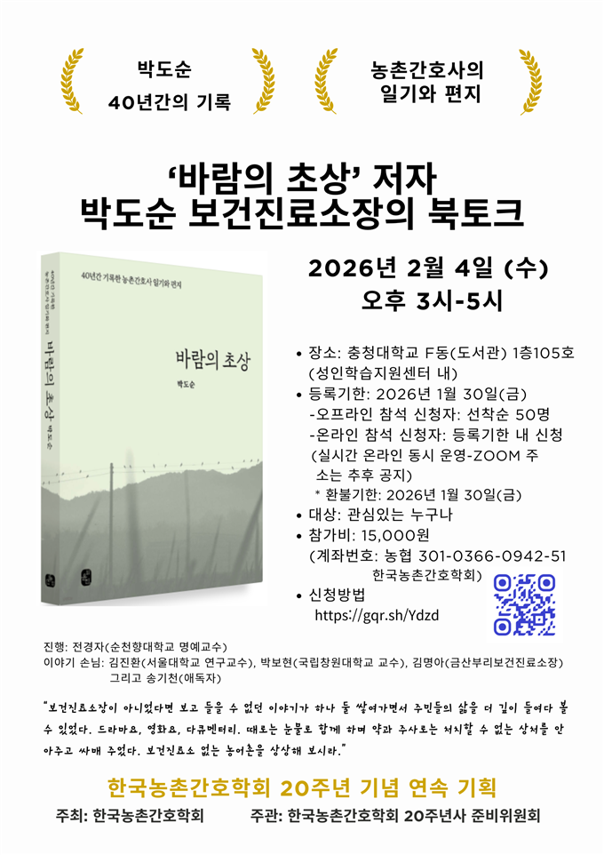 | [한국농촌간호학회] '바람의 초상' 저자 박도순 보건진료소장의 북토크 안내 (등록기한~1.30.) - 26.02.04.(수), 충청대 도서관 |