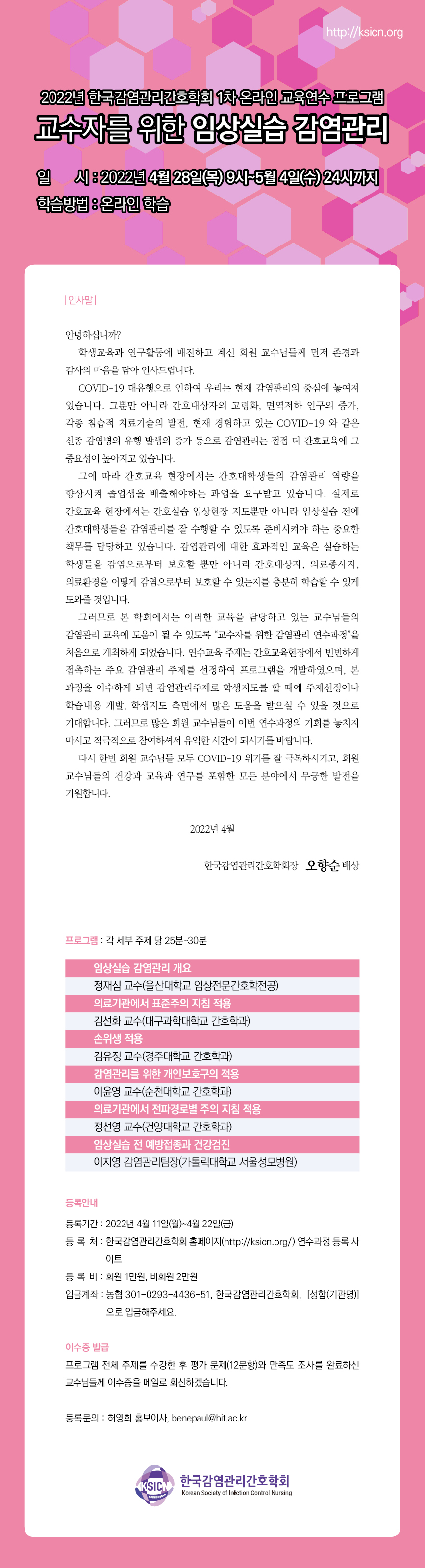 2022년 한국감염관리간호학회 제1차 온라인 교육연수 프로그램 안내
