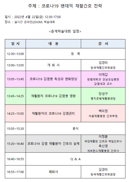 한국재활간호학회에서는 「코로나19 팬데믹 재활간호 전략」을 주제로 춘계학술대회를 개최합니다.