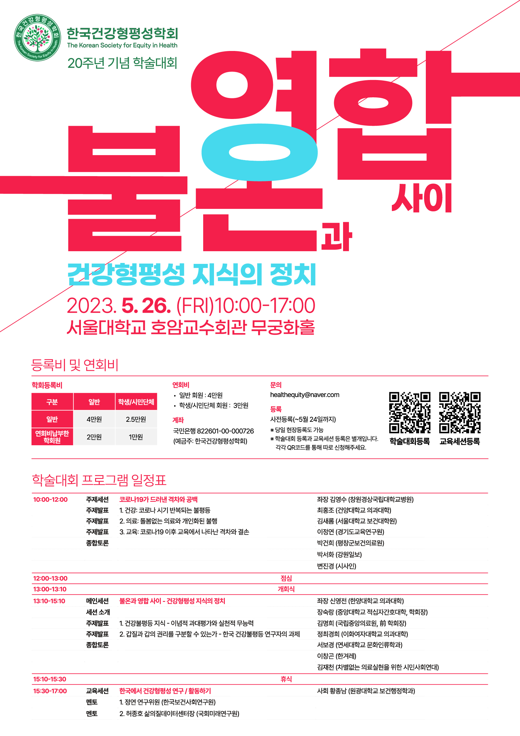 ? 한국건강형평성학회는 '불온과 영합 사이: 건강형평성 지식의 정치'를 주제로 5월 26일(금) 서울대학교 호암교수회관에서 20주년 기념 학술대회를 개최합니다.