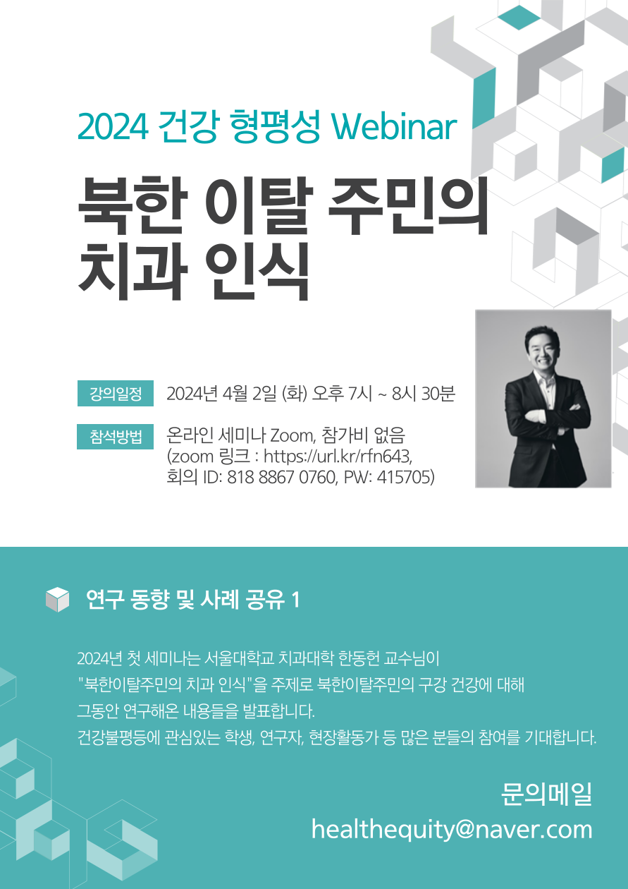 | [한국건강형평성학회] 2024년 Webinar 시리즈 1: 연구 동향 및 사례 공유 |