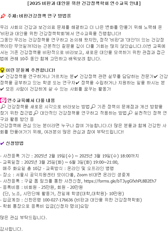 2025 비판과 대안을 위한 건강정책학회 연수교육(3/25~6/3 총 10강 )