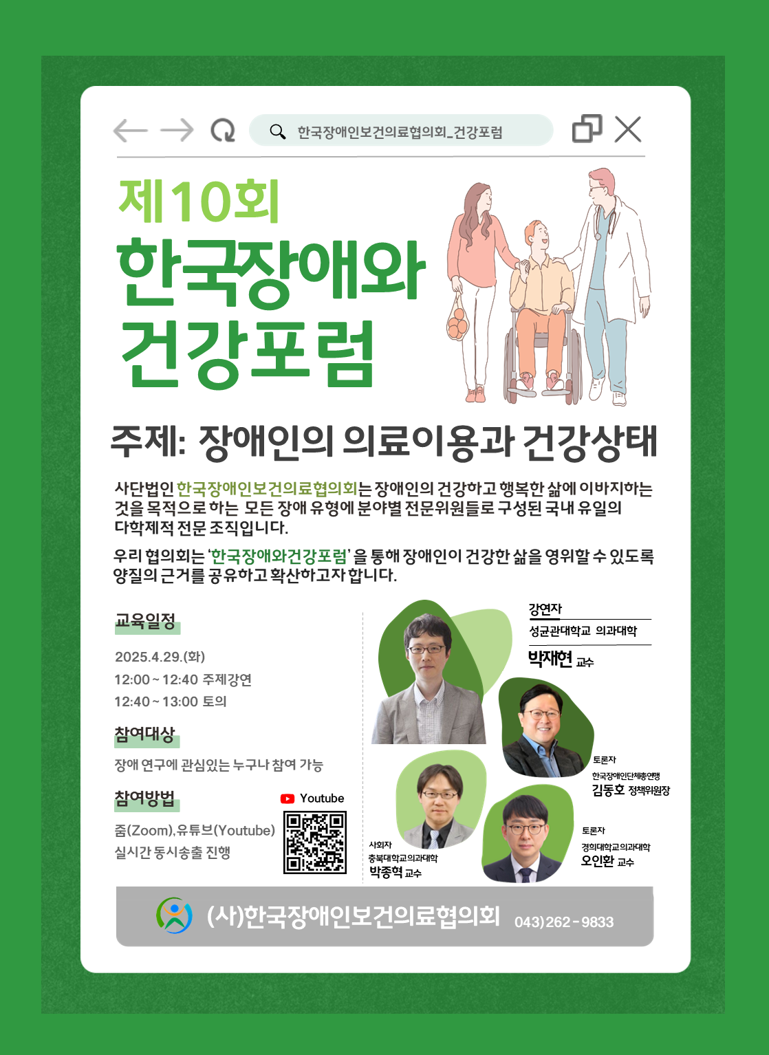 본?포럼은?줌(zoom)과?한국장애인보건의료협의회 공식 유튜브 채널을 통하여 비대면 온라인 생중계로 진행될 예정이오니 많은 관심과 참여 부탁드립니다.