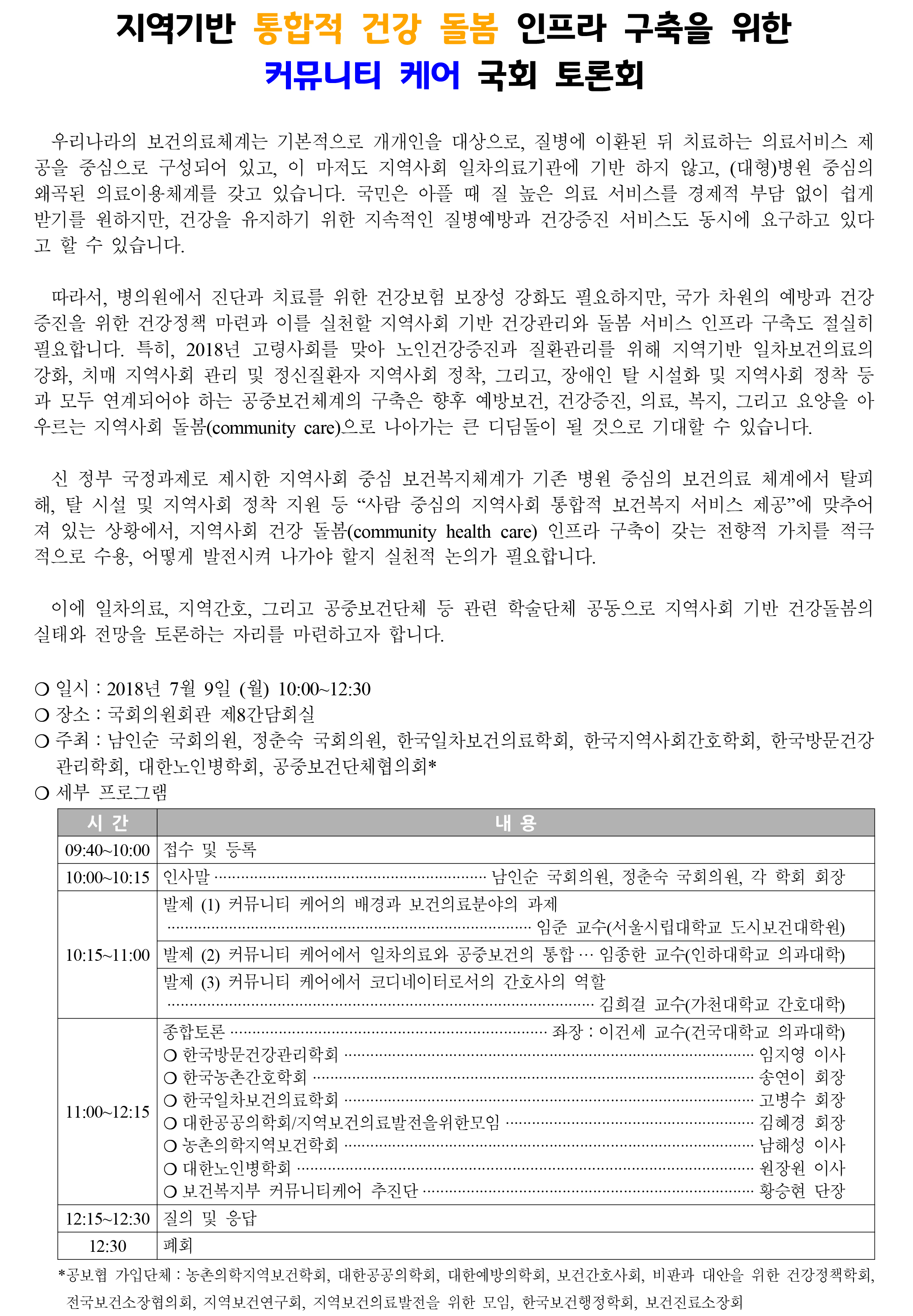 지역기반 통합적 건강 돌봄 인프라 구축을 위한 커뮤니티 케어 국회 토론회 개최 안내