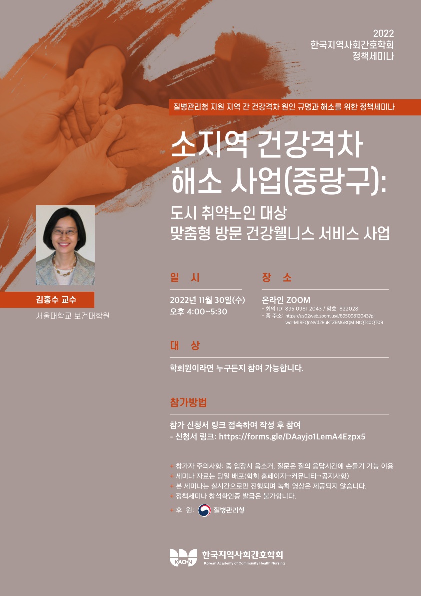 | 2022년 한국지역사회간호학회 정책세미나 안내: 소지역 건강격차 해소 사업 (중랑구) |
