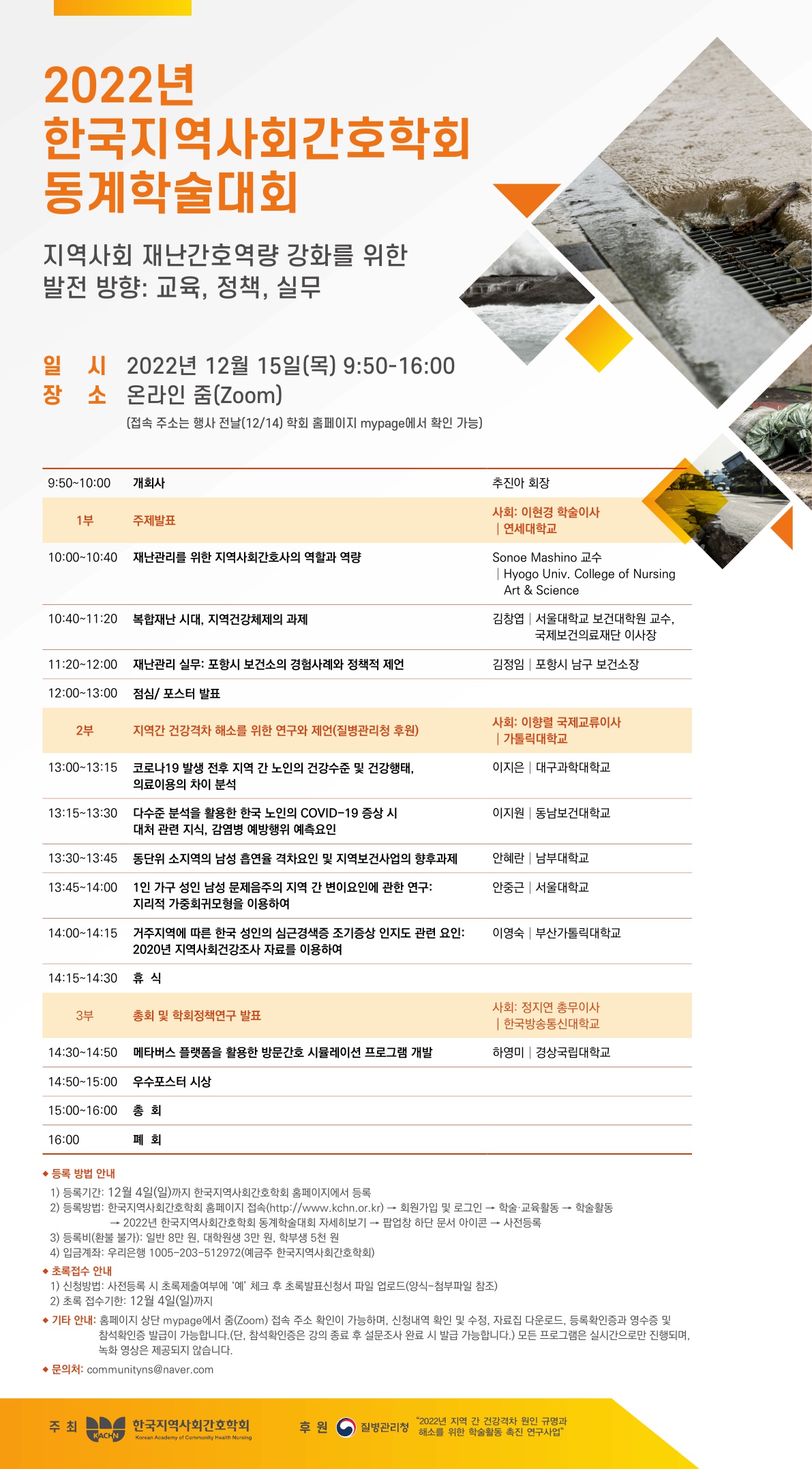 다. 장 소:온라인 실시간 줌(Zoom) (접속 주소는 행사 전날(12/14) 한국지역사회간호학회?홈페이지 mypage에서 확인 가능)