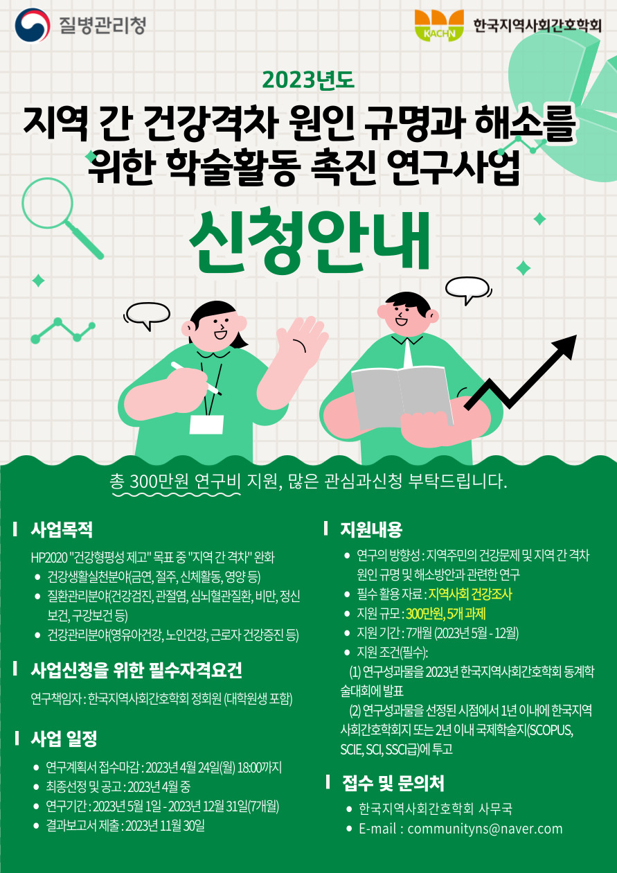 2023년도 질병관리청 지역 간 건강격차 원인 규명과 해소를 위한 학술활동 촉진 연구사업 신청 안내드립니다.