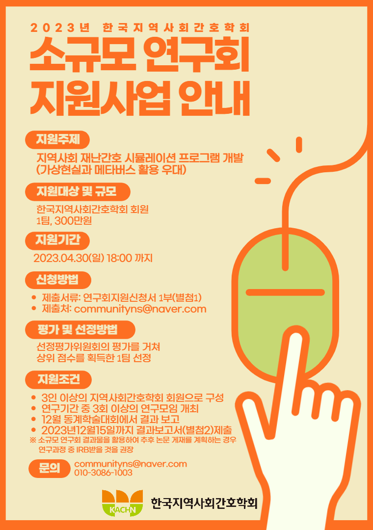 | 2023년 한국지역사회간호학회 소규모 연구회 지원 사업 안내(~4/30 18시까지) |
