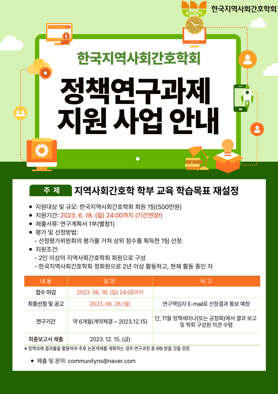 | 2023년 한국지역사회간호학회 정책연구과제 지원사업 안내(~6월 18일까지, 기한연장!) |