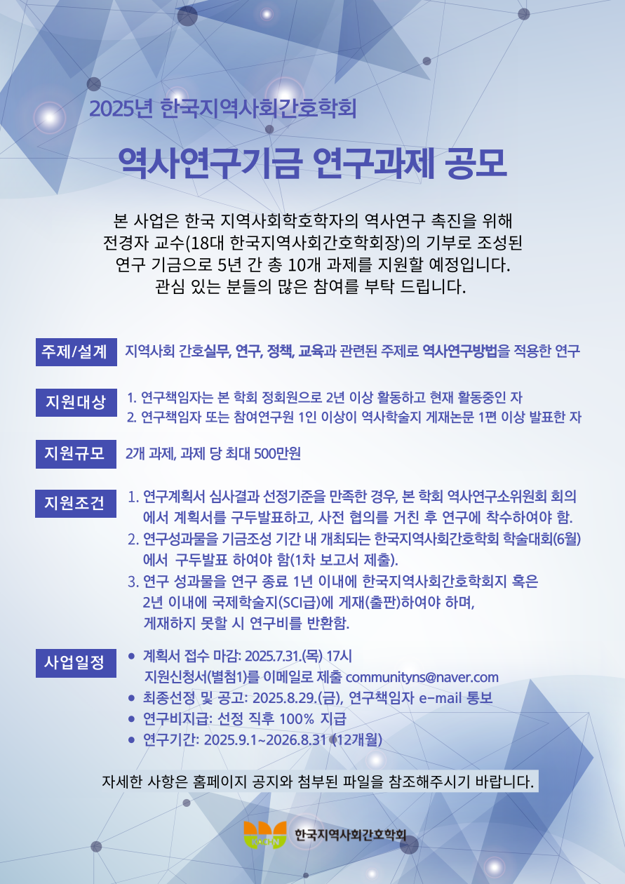 | 다음글 | 2025년 한국지역사회간호학회 하계연합학술대회 안내 - 25.6.26.(목), 연세대학교 ... |