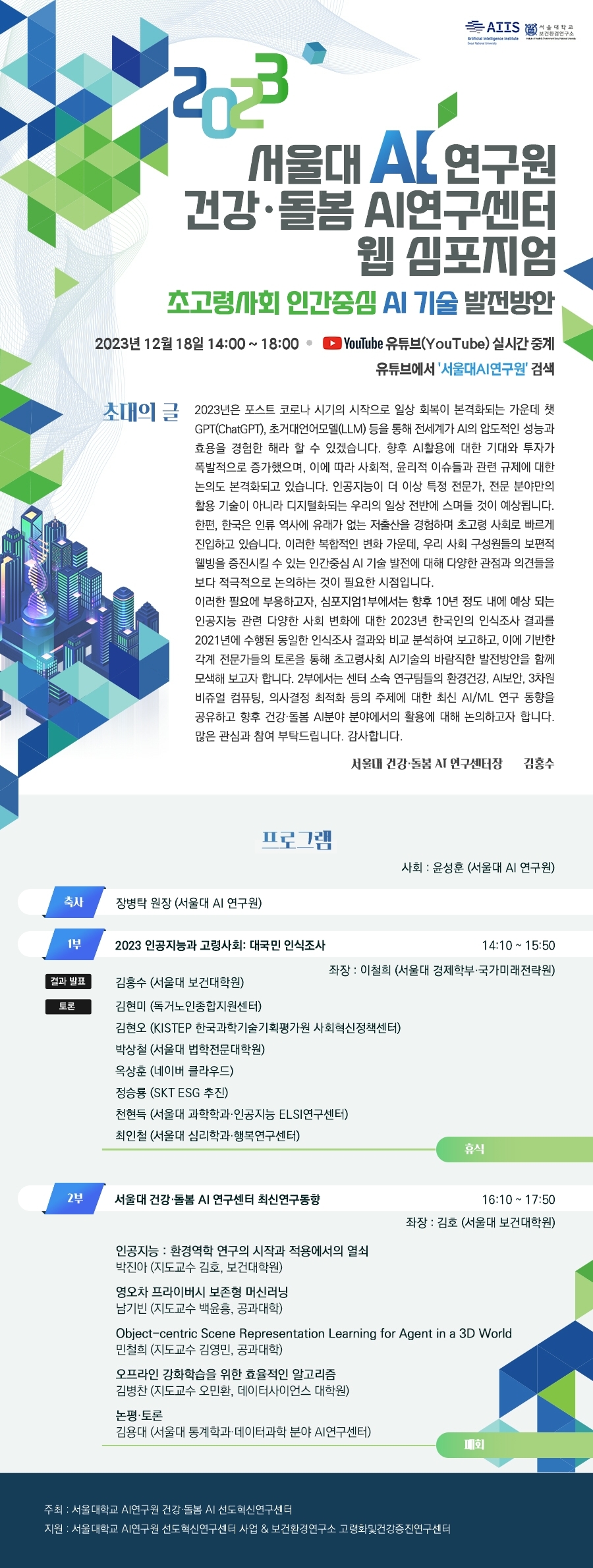 본 심포지엄은 “초고령사회 인간중심 AI 기술?발전방안”이라는?주제로,?1부에서는?2023?인공지능과?고령사회:?대국민?인식조사?결과를?보고하고 각계 전문가분들의 토론?시간을 마련하고자?하며, 2부에서는?서울대?건강·돌봄?AI 연구센터 최신연구동향을?공유하고 논의하고자 합니다.?