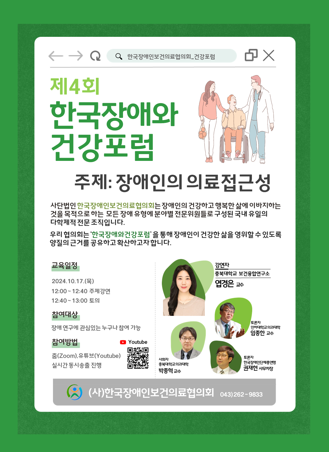 | [한국장애인보건의료협의회] 2024년 제4회 한국장애와건강포럼 개최 안내(10/17 목) |