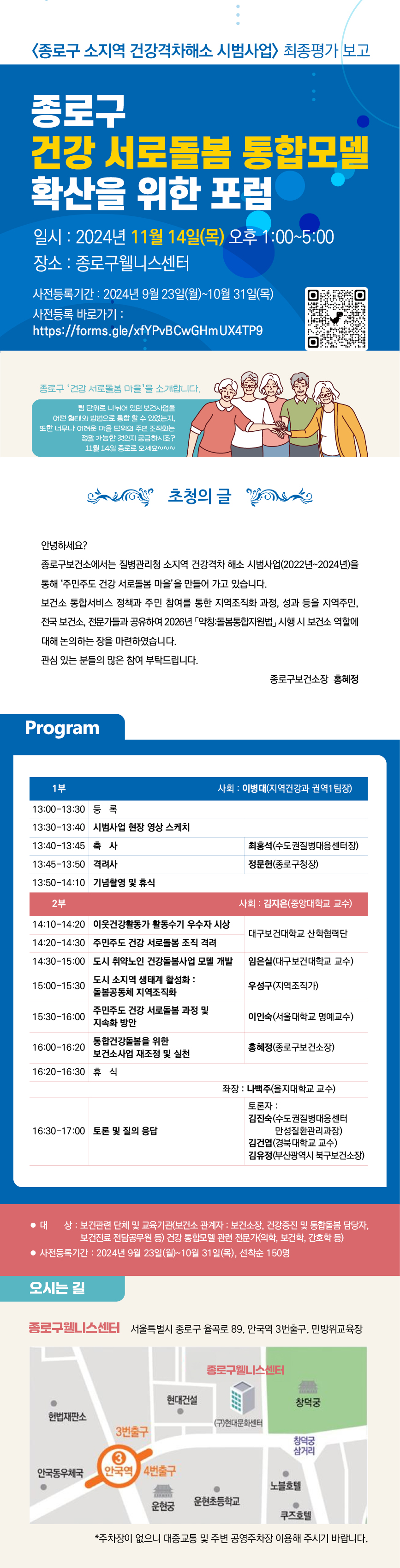 | 돌봄통합지원법 시행시 보건소 역할에 대한 논의: 종로구 '주민주도 건강 서로돌봄 마을' 확산 포럼 11/24(목) 1:00~5:00 |
