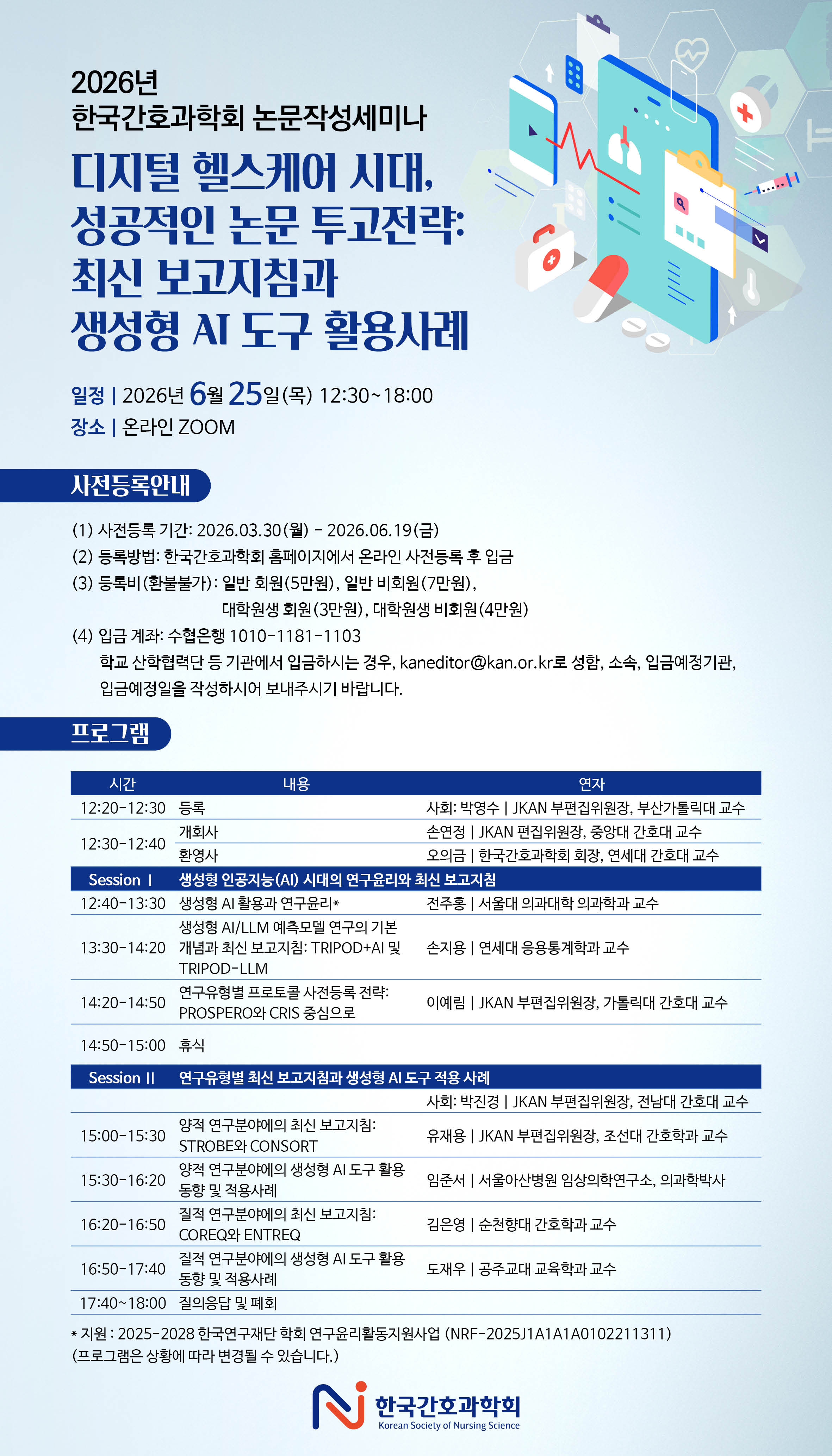 - 등록방법: 홈페이지(www.kan.or.kr) -> 학술 - 교육 - 행사메뉴 클릭 -> 한국간호과학회 - 2026년 논문작성세미나 사전등록 -> 온라인신청 후 입금(등록자이름 입금필수)