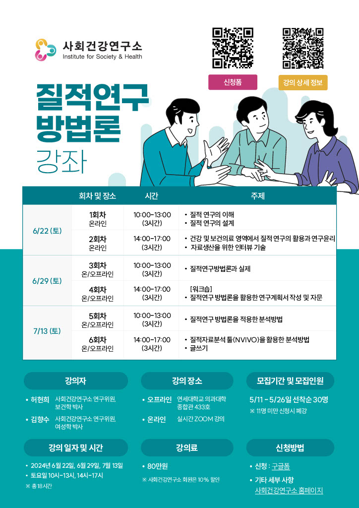 ? ? -?강좌 목표?:?질적 연구 방법론의 철학,?연구 방법 등 이론과 연구설계,?연구질문만들기,?연구방법별 분석전략,?글쓰기 등 방법과 연구 수행 역량의 함양.?이를 통해 건강과 보건의료 영역의 질적 연구 수행과 논문작성 능력의 배양 -??일시?: 2024년?6월?22일, 6월?29일, 7월?13일(토요일?10:00~17:00) -??강의 시간: 1회당?3시간.?총?6회 -??장소:?연세대학교 보건대학원?+실시간 온라인 강의 -??운영방식?:?대면/비대면 병행(4회),?비대면(2회)?수업,?강의 및 질의응답,?실습 -??대상?:?질적 연구에 관심있는 대학원생,?연구자,?활동가 (예,?질적 연구를 수행해본 적이 있다.?질적 연구로 논문을 작성할 계획이 있다.?질적 연구로 조사해야 할 연구문제가 있다.?질적 연구에 관심이 있다.) -??강의/교수자:?허현희(사회건강연구소 연구위원,?보건학 박사),?김향수(사회건강연구소 연구위원,?여성학 박사) ? *??강의신청 문의 -??강의료:?총?80만원(사회건강연구소 회원 할인, 10%) (계좌번호:?국민은행?815601-04-142617) -??수강신청?:?선착순 마감 -??수강신청 기간?: 5월?11일(금)-26일(금)?선착순 마감 -??수강료 환불?:?강의 시작?3주전까지 환불 가능, 6월?1일부터는 수강료가 환불되지 않음.(수강하실 분들의 신중한 판단을 부탁드립니다) -??주교재?: ? ? 질적 연구방법론 - 다섯가지 접근(제4판) - 저자 :?Creswell & Poth(저),?조흥식 외(역) - 도서 정보 :?학지사, 2021 ISBN : 9788999725029 ? ※ 주교재는 따로 제공되지 않습니다.?